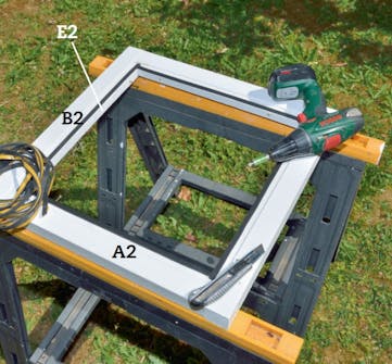 Saml rammerne til tagvinduerne. Sav lægterne A2 og B2 til på længde, og skru en ramme sammen med 5 x 80 mm skruer. Det er en god idé at bore for til skruerne. Mål op til falslister (E2) til glasset, og sav dem til.