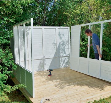 Lysthuset består af fire sider, der bygges en ad gangen - som moduler - og samles til sidst. Hver side består af en ramme, som er opdelt i fire mindre felter. Disse felter fyldes ud med enten glas eller brædder og på forsiden to døre.
