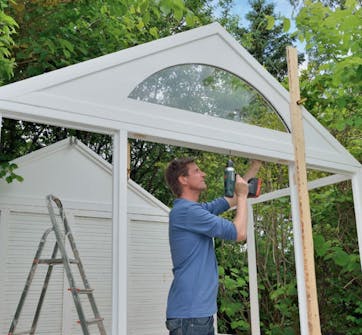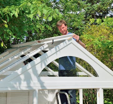 Så er det tid til at montere glasset i lysthuset. Begynd med de store ruder til taget. Når de er lagt i, skruer du listerne (H) fast til tagspærene, som kan holde glasset på plads. Du skal også montere de to tagvinduer - et i hver side. De placeres også mellem spærene og fastgøres til brættet (J) i tagryggen.