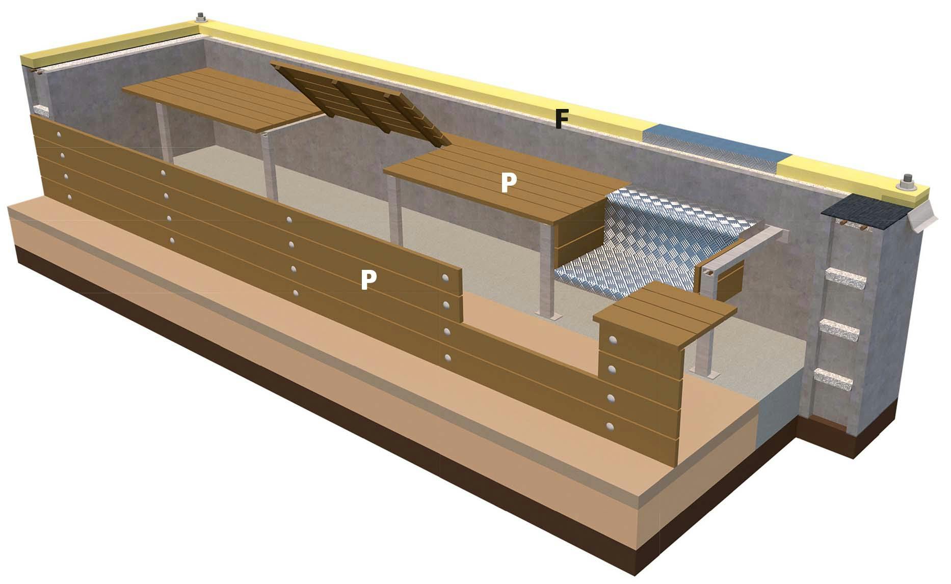 Der monteres brædder (P) på stålbenene, så bænken lukkes af både på fronten og toppen og bruges til opbevaring. Sædet er opdelt i flere sektioner og fastgjort med pianohængsler, så det kan åbnes.