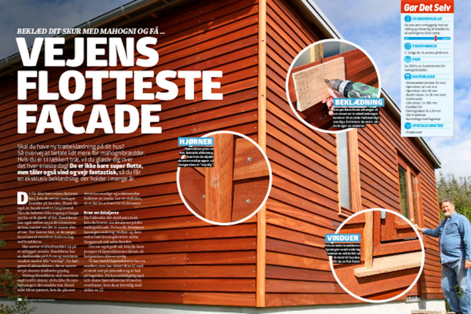 For at få et flot resultat, er det vigtigt, at brædderne skæres nøjagtig til, og at skruerne placeres præcist i lige rækker. Det sikrer du med en boreskabelon. Sørg også for, at brædderne sidder helt lige - i samme højde på begge sider af vinduer og døre. Hvis brædderne ikke er lange nok, må du acceptere samlinger. Det er pænest, hvis du placerer samlingerne jævnt fordelt, uden system.