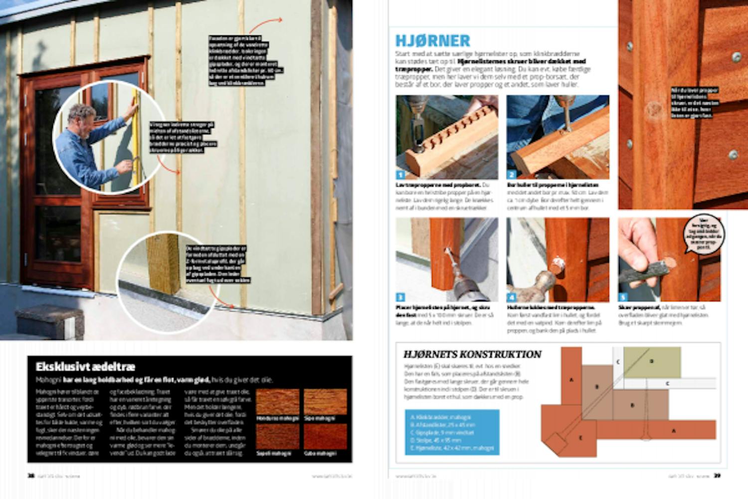 Start med at sætte særlige hjørnelister op, som klinkbrædderne kan stødes tæt op til. Hjørnelisternes skruer bliver dækket med træpropper. Det giver en elegant løsning. Du kan evt. købe færdige træpropper, men her laver vi dem selv med et prop-borsæt, der består af et bor, der laver propper og et andet, som laver huller.
