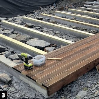 Remmen af træ skal på, så terrassebrædderne kan skrues fast. Bor for til alle gevindstængerne, og montér alle træremmene. Her kan den sidste opretning også klares, hvis det er nødvendigt.