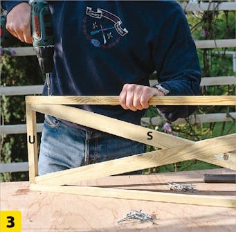 Sæt krydsene sammen. De er bladet sammen ved at save en række snit halvt ned i begge lister, hvorefter træet er fjernet med et stemmejern. Enderne skæres til efter din opmærkning.