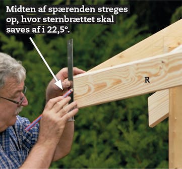 Sternbrædderne (R) saves af i en 30° vinkel langs den kant, der vender opad, så flugter de nemlig med tagets hældning. Der, hvor sternbrædderne mødes, saves de i et snit på 22,5°, og til slut skrues alle sternbrædderne på.