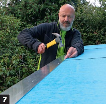 Underpap rulles ud, limes på og sømmes fast. I første omgang får det lov til at hænge lidt ud over kanten.