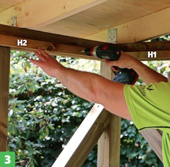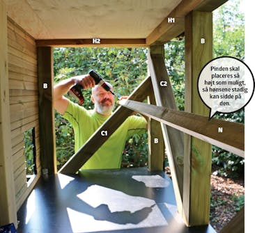 Reglar (H1 og H2) skrues fast på toprem men over huset. De skal holde hønsehusets tagplade på plads.