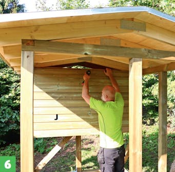 Tagspærene monteres med vinkelbeslag (50 x 35 mm) og beslagskruer. De resterende fire tagspær er identiske med det første.