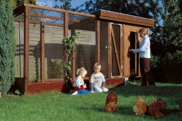 Hønsegården hegner vi ind med volierenet. Så kan hønsene og familien få selskab af eksotiske småfugle, der ville smutte ud gennem et grovmasket kyllingenet.
