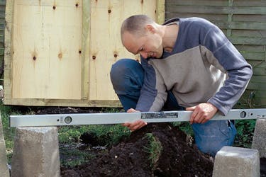 Stolperne sættes i hullerne, efter at vi har savet hak til overliggerne. Overliggere og stolper skrues sammen, når de er i lod og vage. Jorden stampes.