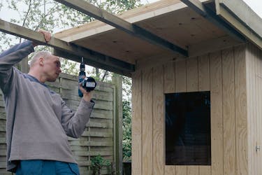 På oversiden forsyner vi pladen med trekantlister og tagfod, inden vi lægger den op på tre lægter, vi har gjort fast oven på væggene.