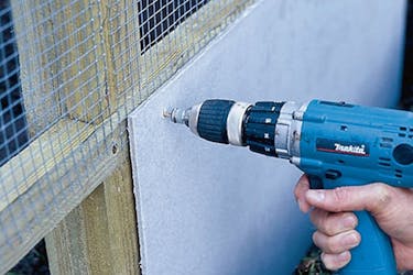 Eternitpladerne graves ned i jorden og fastgøres hele vejen rundt til de vandrette lægter med 4 x 50 mm climateskruer gennem forborede huller.