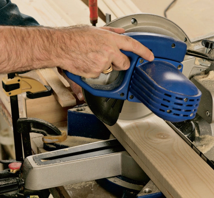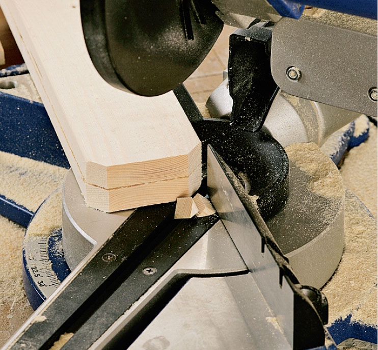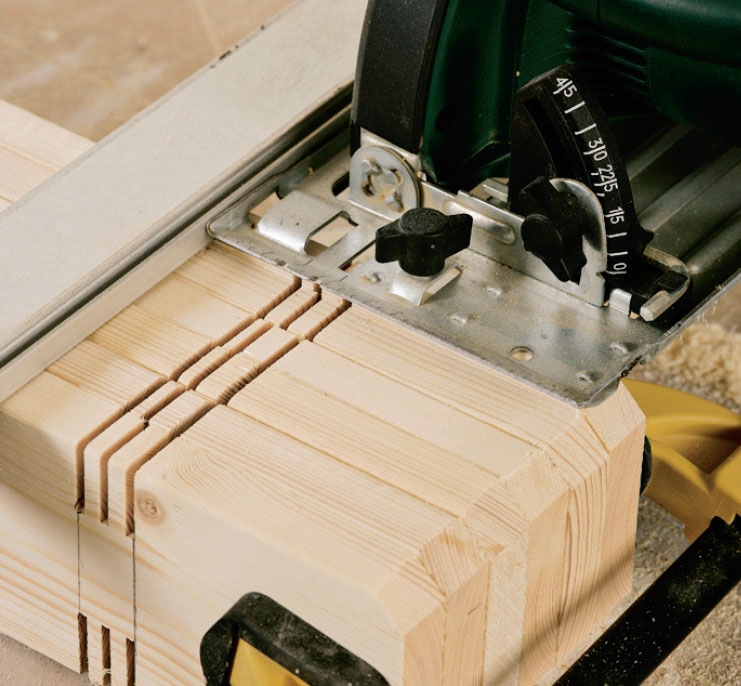 Med en god portion tålmodighed kan brædderne fremstilles enkeltvis med hjælp fra vinkel, håndsav og stemmejern. Men det går en hel del hurtigere med en kapsav. Med flere brædder spændt sammen klarer den præcis dybdeskæring til hakkene i brædderne.