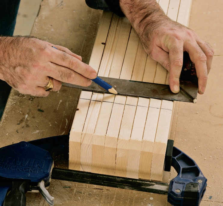 Spænd 8-10 brædder sammen, og mærk op til hak med vinkel og blyant. Der vinkles op hele vejen rundt om de sammenspændte brædder.