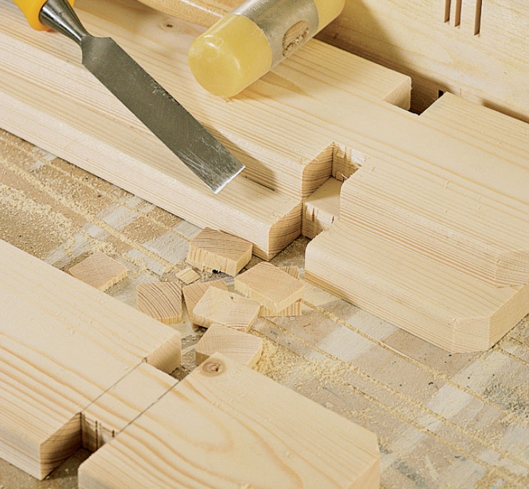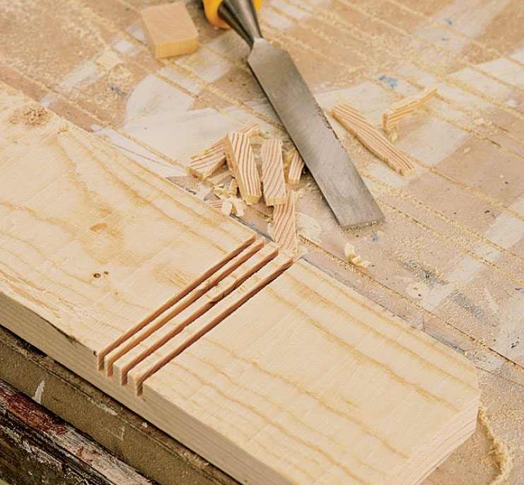De udsavede spor gør det nemt at færdiggøre hakkene med et stemmejern. Fjern træet mellem sporene, og rens op i hakkenes bund.