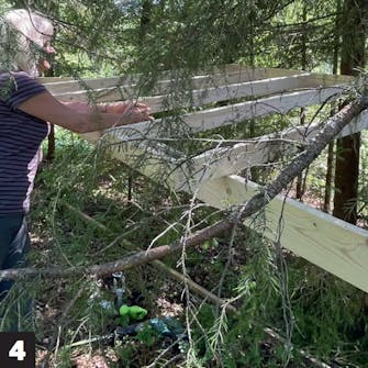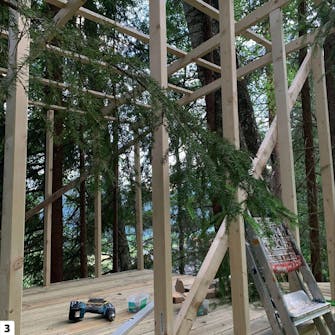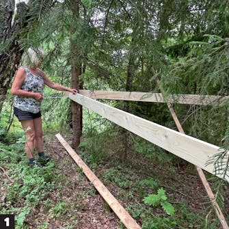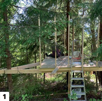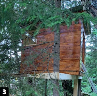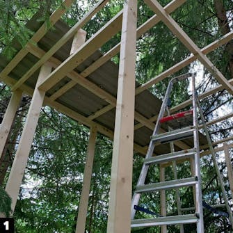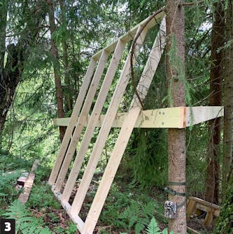 Her er der udvalgt tre træer, som skal bære hytten. På ydersiden af træerne fastgøres de tre bjælker med gennemgående bolte. Sammen danner bjælkerne en trekantet ramme på ca. 2,5 x 3,5 x 4,5 meter. Når rammen sidder korrekt, skal rammens hjørner skrues sammen, inden de til sidst kan skæres af i længden.