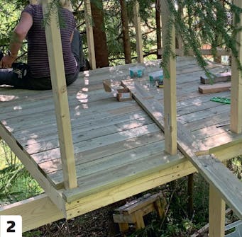 Gulvet i hytten laves af terrassebrædder, og de kan enten skrues eller sømmes fast direkte i bundrammens strøer.