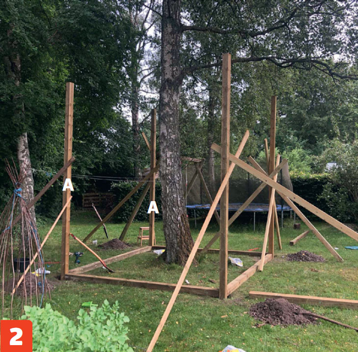 Grav huller til hjørnestolperne (A). Her bruges et motoriseret pælebor. Du kan selvfølgelig også bruge et manuelt pælebor eller en drænspade - det tager bare længere tid. Hullet skal være ca. 90 cm dybt.