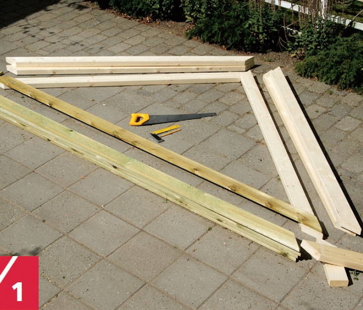 Fastspænd 3 brædder vandret mellem pælene, der hvor spærene skal placeres. Sav stolperne endeligt til med en fukssvans.