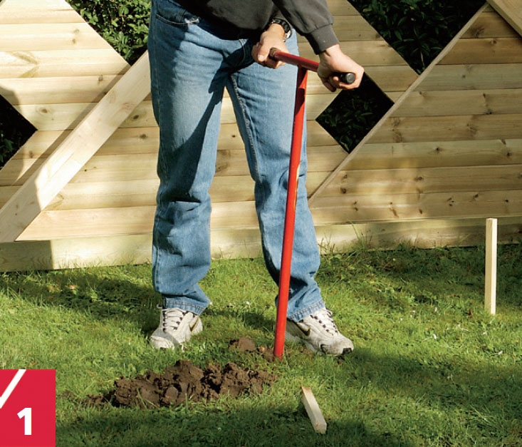 Grav hullerne cirka 90 cm dybe med et pælebor. Sæt pælene i lod, og stamp jorden godt for hver 10 cm. Hvis pælenes trykimprægnering brydes, skal den trykimprægnerede ende i jorden.