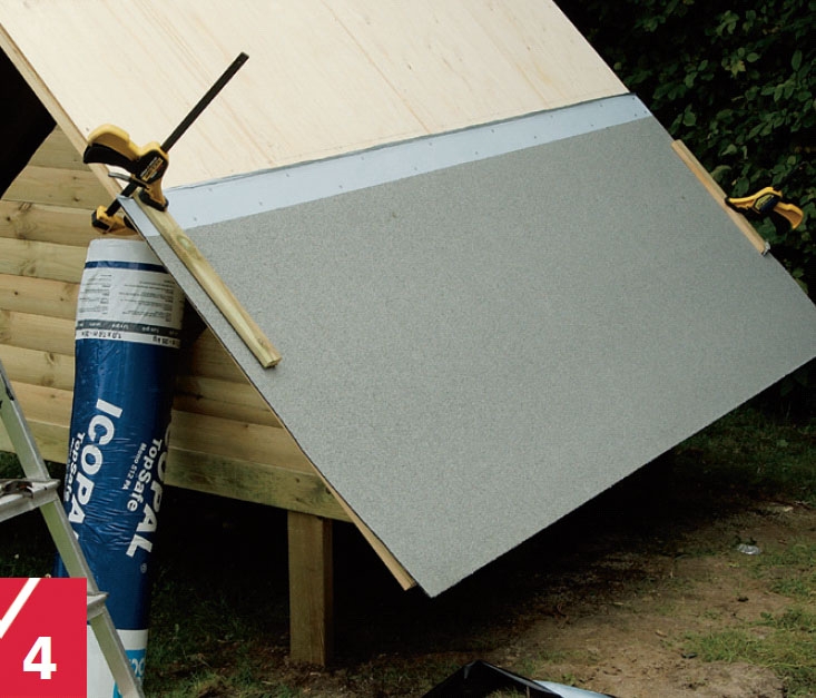 Rul tagpap fra gavl til gavl, og hold den fast med tvinger. Slå et søm i midten af folien, ret tagpappet til og pres den nederste del fast til taget. Stryg tagkit langs gavlene, tryk pappet ned og søm i den grå folie i zig-zag fra side til side.