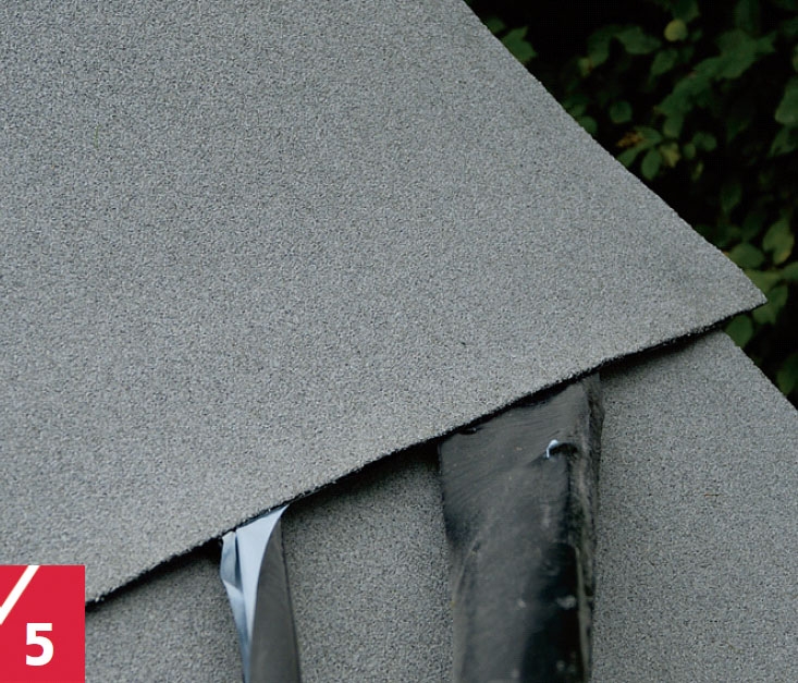 Læg næste bane på, søm den foroven og stryg tagkit langs siderne. Fjern så folien, der beskytter den selvklæbende lim. Tryk samlingen godt sammen, så limen binder. Søm i zig-zag op langs kanten.