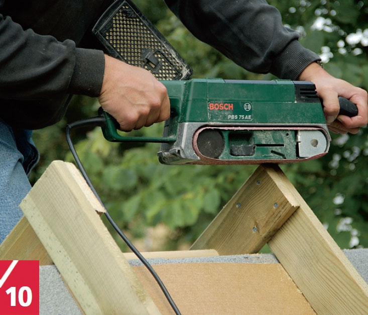 Tjek, at midterspæret flugter med gavlene. Det gøres med et lige bræt. Hvis du bygger et tag, der er længere end det viste, så sæt spær mellem gavlene for hver 1 meter. Så sidder taget godt fast, og konstruktionen er solid.