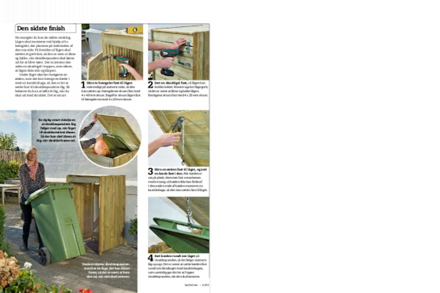 Nu mangler du kun de sidste småting. Lågen skal monteres ved hjælp af to hængsler, der placeres på indersiden af den ene side. På forsiden af lågen skal sættes et greb fast, så den er nem at åbne og lukke, når skraldespanden skal køres ud for at blive tømt. Der monteres desuden en skudrigel i toppen, som sikrer, at lågen ikke står og klaprer.