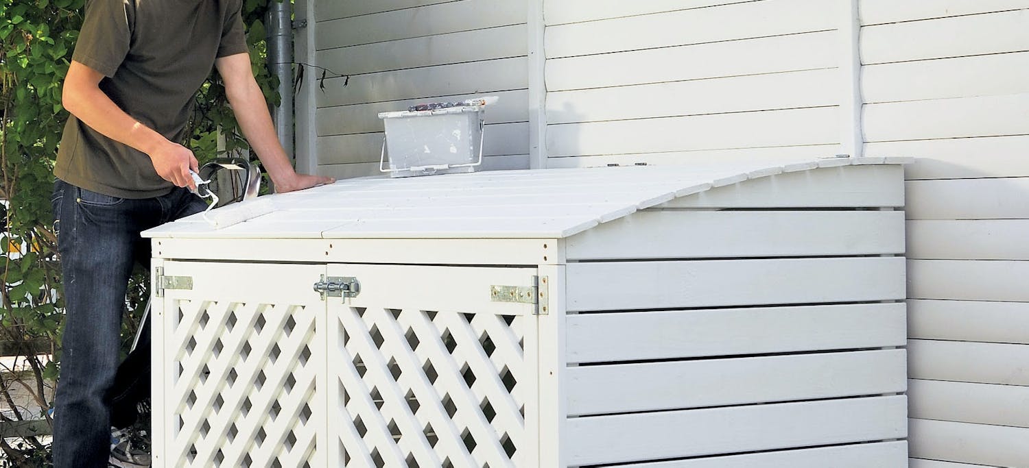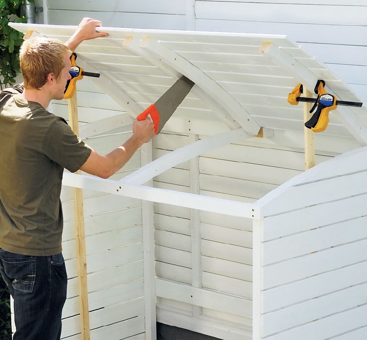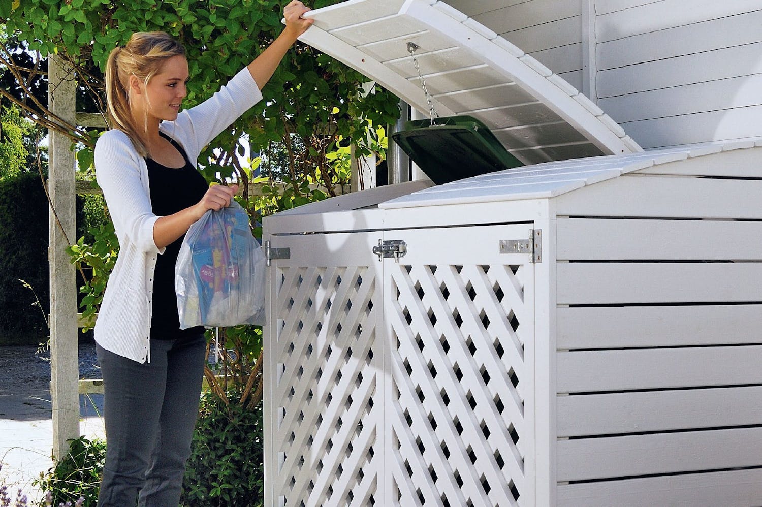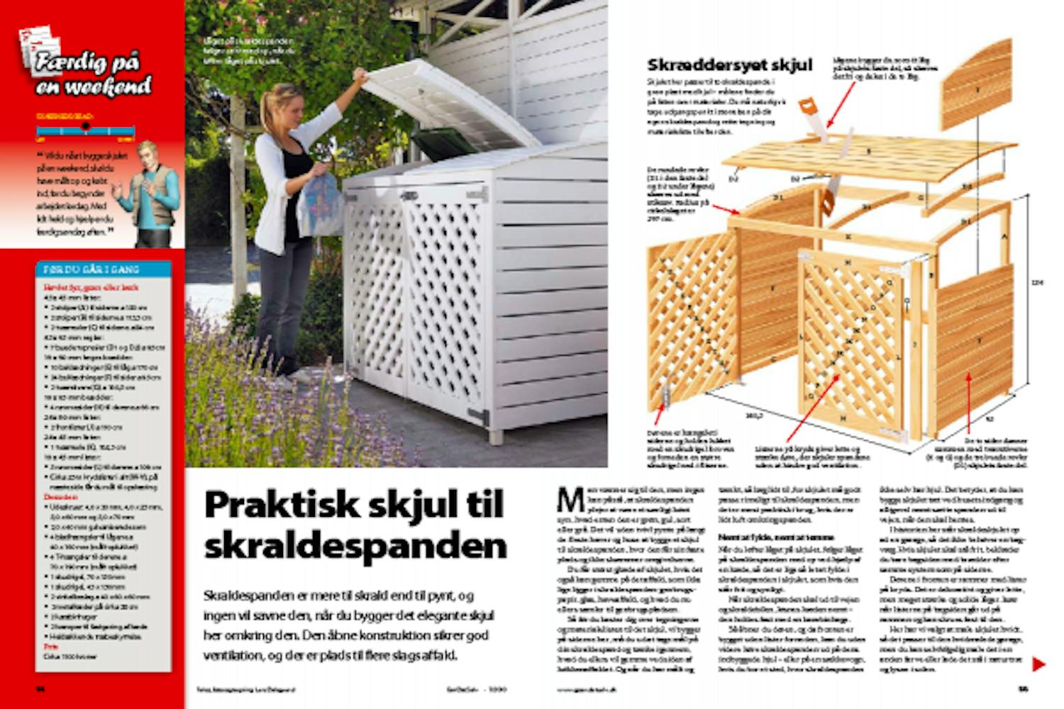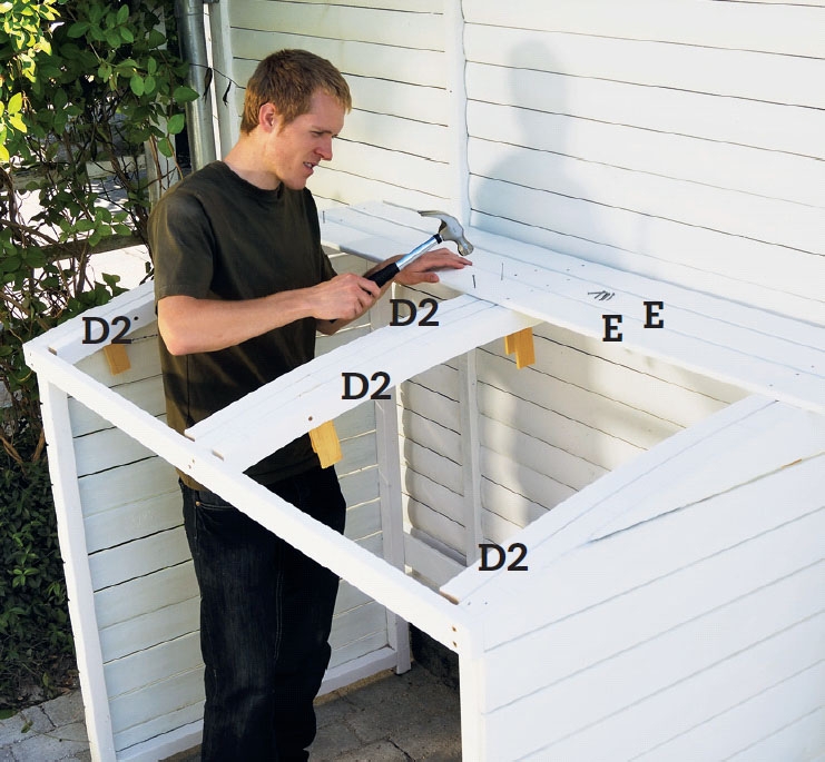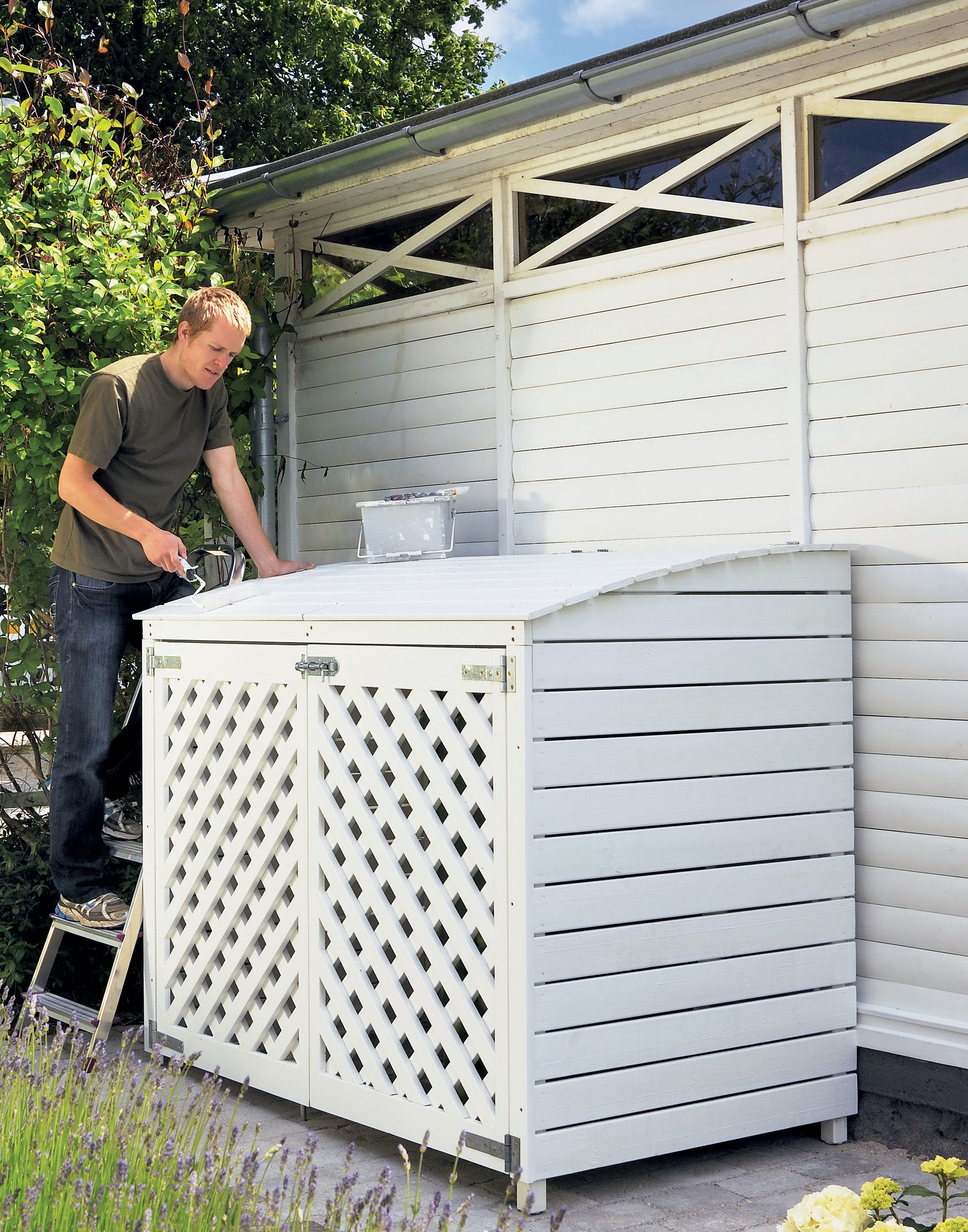 Hvis din skraldespand som her har et hængslet låg, kan du lette den fremtidige brug ved at forbinde låget på det nye skjul med skraldespandens eget låg, så det følger med skjulets låg op.