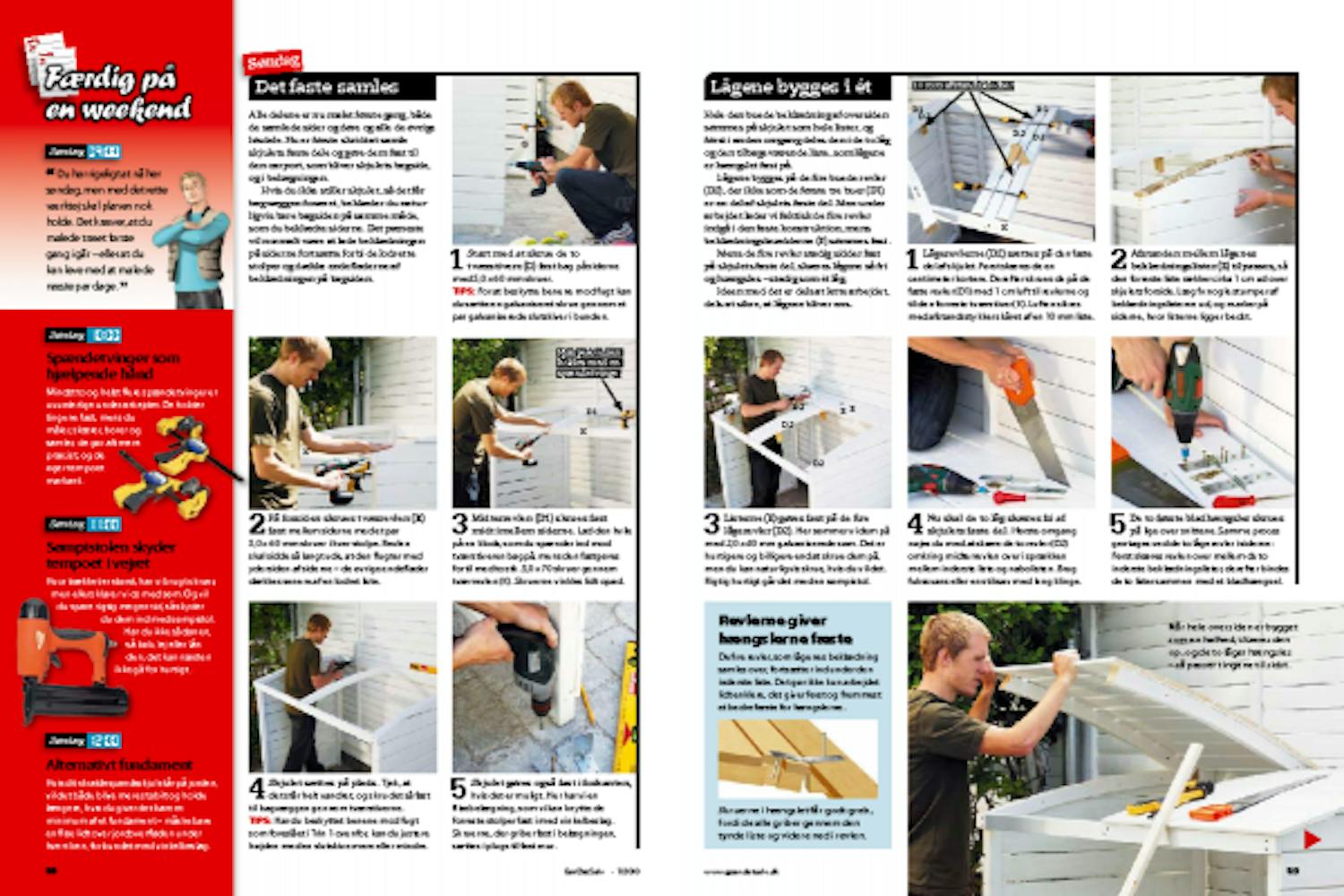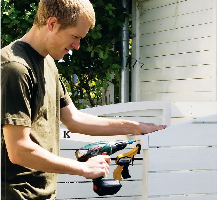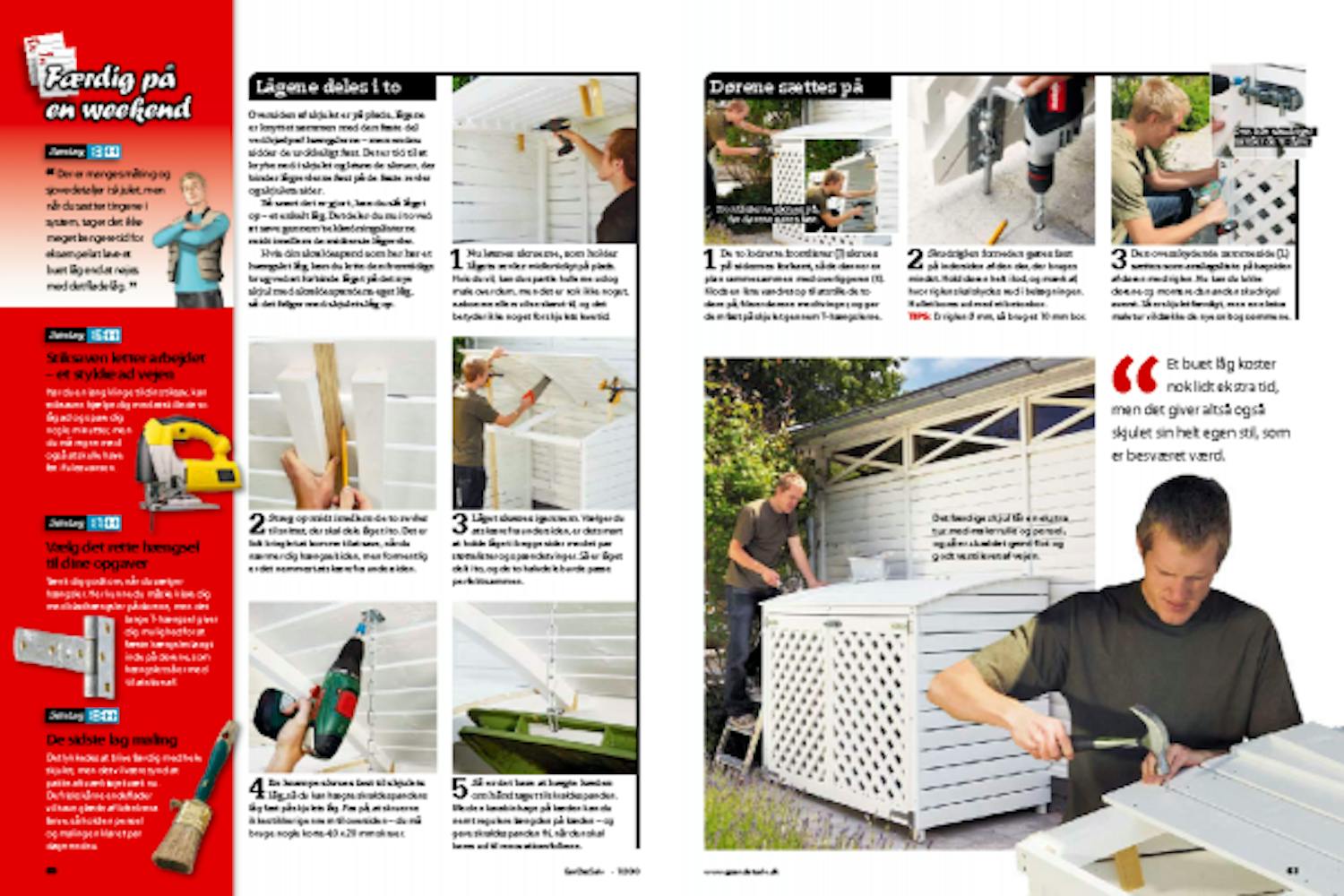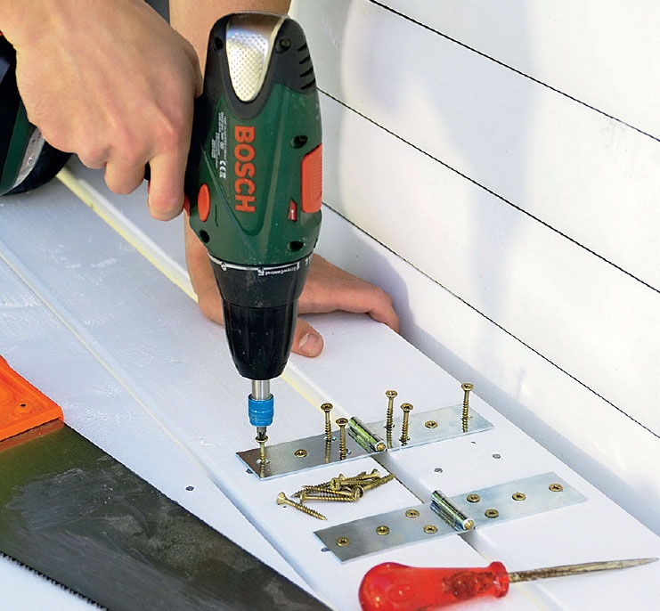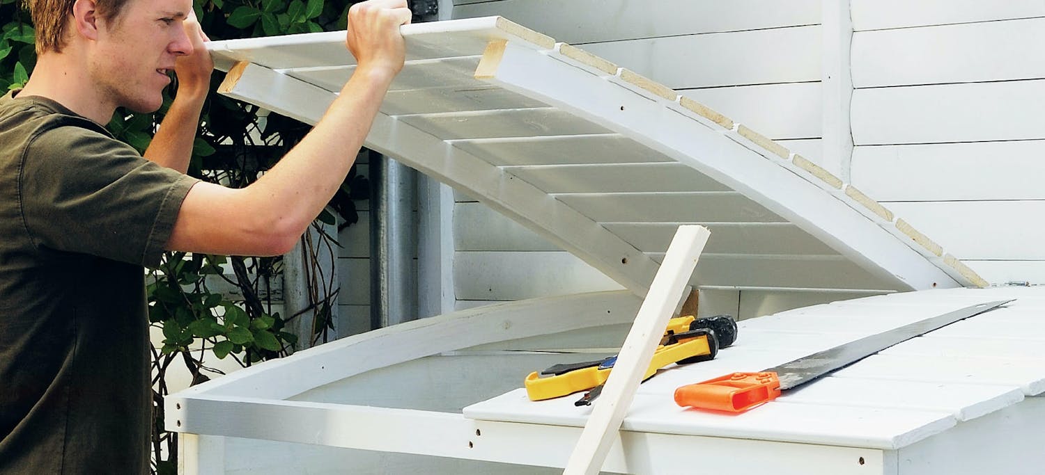 Nu løsnes skruerne, som holder lågets revler midlertidigt på plads. Hvis du vil, kan du spartle hullerne ud og male over dem, men det er nok ikke noget, naboerne ellers vil se skævt til, og det betyder ikke noget for skjulets levetid.