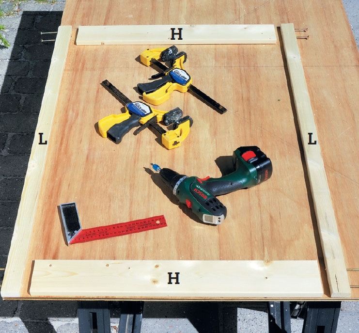 Rammerne til dørene samles af de vandrette lister (H) og de lodrette lister (L) med 5,0 x 70 mm skruer, to i hvert hjørne. For at sikre de rette vinkler spænder vi listerne fast på en plade med vinkelrette hjørner, mens skruerne sættes i. Bor for.