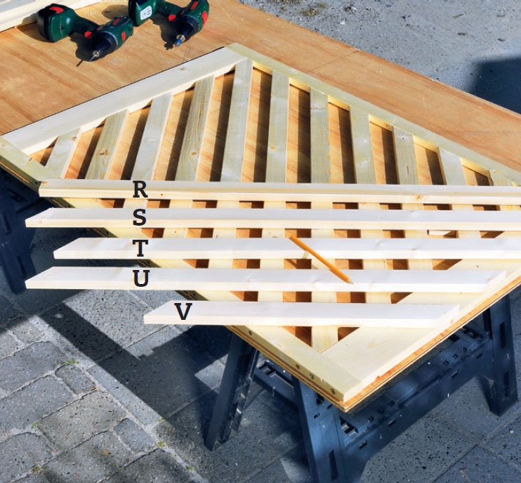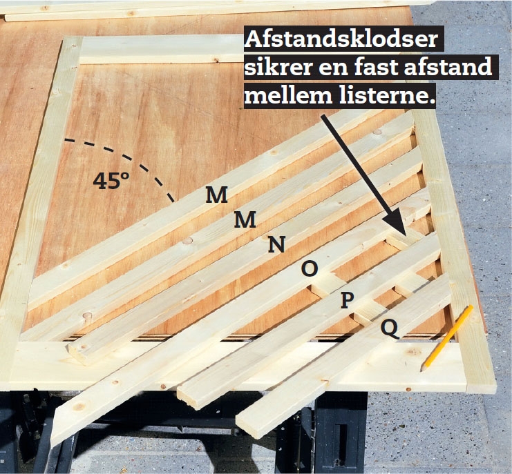 Første lag krydslister (M-Q) bygges inde i rammen. Afstanden mellem listerne styres med 5 cm brede klodser, før du streger op til den endelige tilskæring. Begynd med de længste lister (M). De to, der møder et hjørne, får et ekstra 45 graders snit.