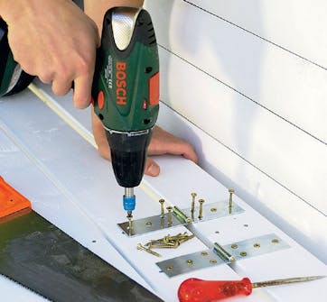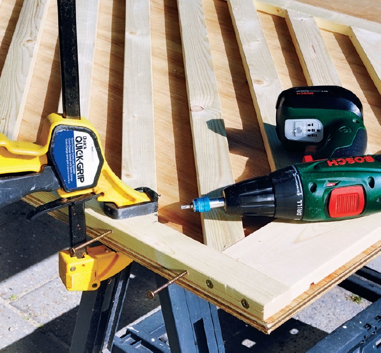 Siderammerne samles med 5,0 x 70 mm skruer. Delene spænder vi ned mod pladen med rette kanter, mens vi måler op, borer for og sætter skruer i. Også her kan du bruge selvskærende skruer, men bor helst for for at sikre, at træet ikke flækker.