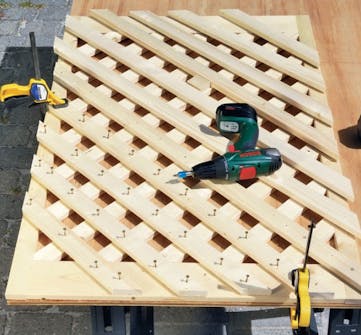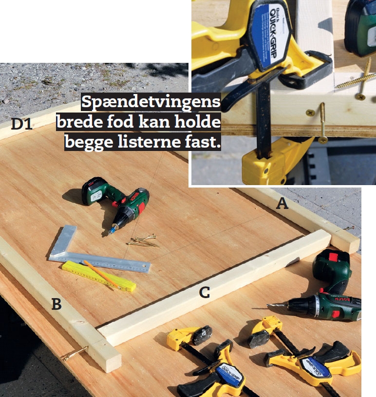 Krydslisterne gøres fast i rammen med 5,0 x 70 mm skruer. Listerne fikseres med en solid spændetvinge eller skruetvinge, inden skruen sættes gennem rammen ind i listerne. Bor for, og forsænk, medmindre skruerne selv klarer det.