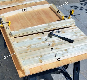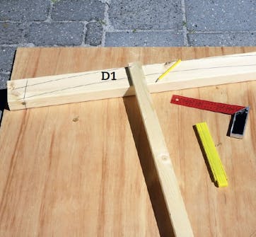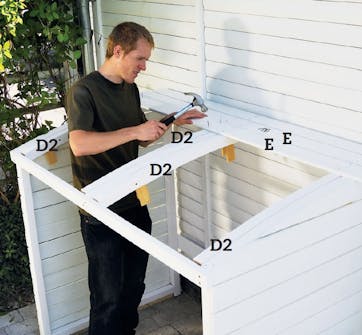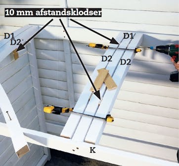 Lågerevlerne (D2) sættes på den faste del af skjulet. Først skæres de en centimeter kortere. Derefter skrues de på de faste revler (D1) med 1 cm luft til revlerne og til den forreste tværstiver (K). Luften sikres med afstandsstykker skåret af en 10 mm liste.