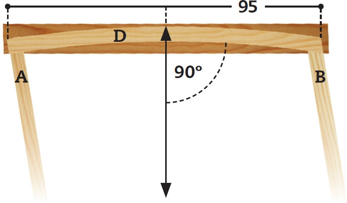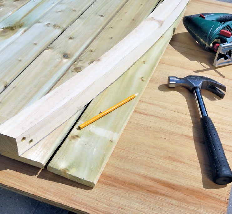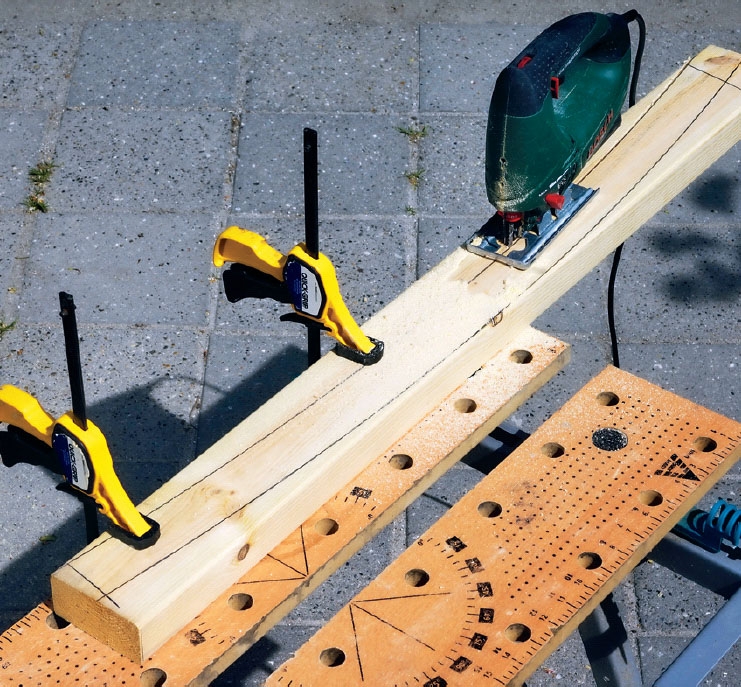 De buede revler (D1 og D2) skærer du ud af 45 x 95 mm reglar. Buen tegner du med en radius 297 cm på oversiden og 292,5 cm på undersiden. Så stor en passer har kun de færreste, så vi bruger en liste med et søm som centrum og slår de to buer i de to ønskede afstande fra sømmet. Højden på revlen bliver på den måde 4,5 cm.