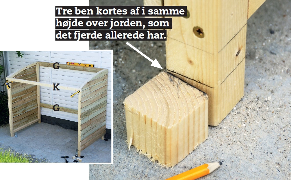 Før du maler og samler den faste del af skjulet, kan du lige så godt tage højde for, at den efter al sandsynlighed står på et skrånende underlag. Siderne samles derfor midlertidigt med de tre vandrette lister (G, G og K) og klodses op, så alt står vandret, og et ben er nede ved jorden. Mål afstanden, hvor der er længst fra et ben til jorden, og afsæt samme afstand over jorden på de andre tre ben. Kort dem af ved mærket med en stiksav.