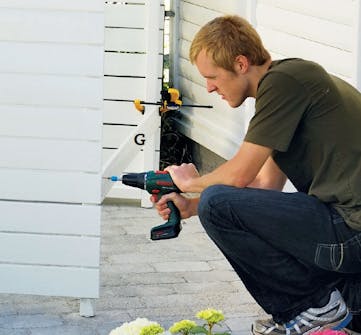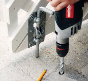 Skudriglen forneden gøres fast på indersiden af den dør, der bruges mindst. Hold døren helt i lod, og mærk af, hvor riglen skal skydes ned i belægningen. Hullet bores ud med et betonbor. TIPS: Er riglen 8 mm, så brug et 10 mm bor.