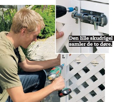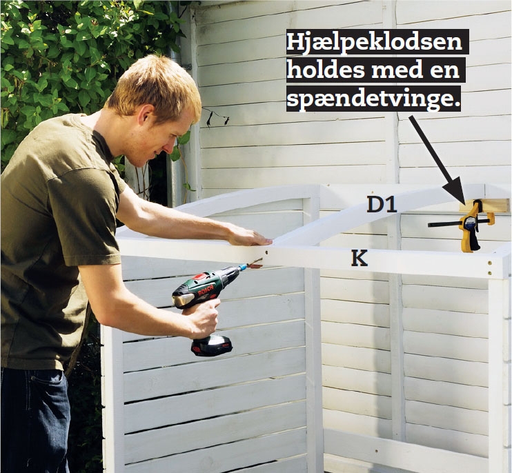En krampe skrues fast til skjulets låg, så du kan hægte skraldespandens låg fast på skjulets låg. Pas på, at skruerne ikke stikker igennem til oversiden - du må bruge nogle korte 4,0 x 20 mm skruer.