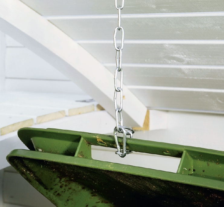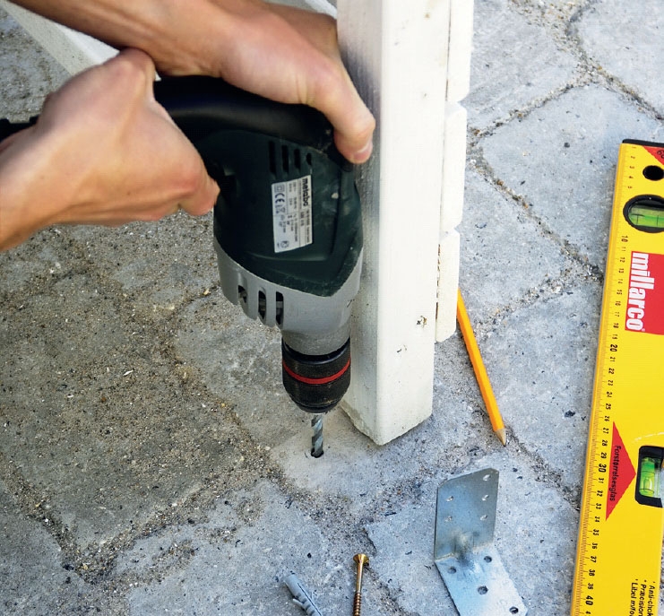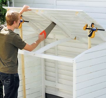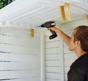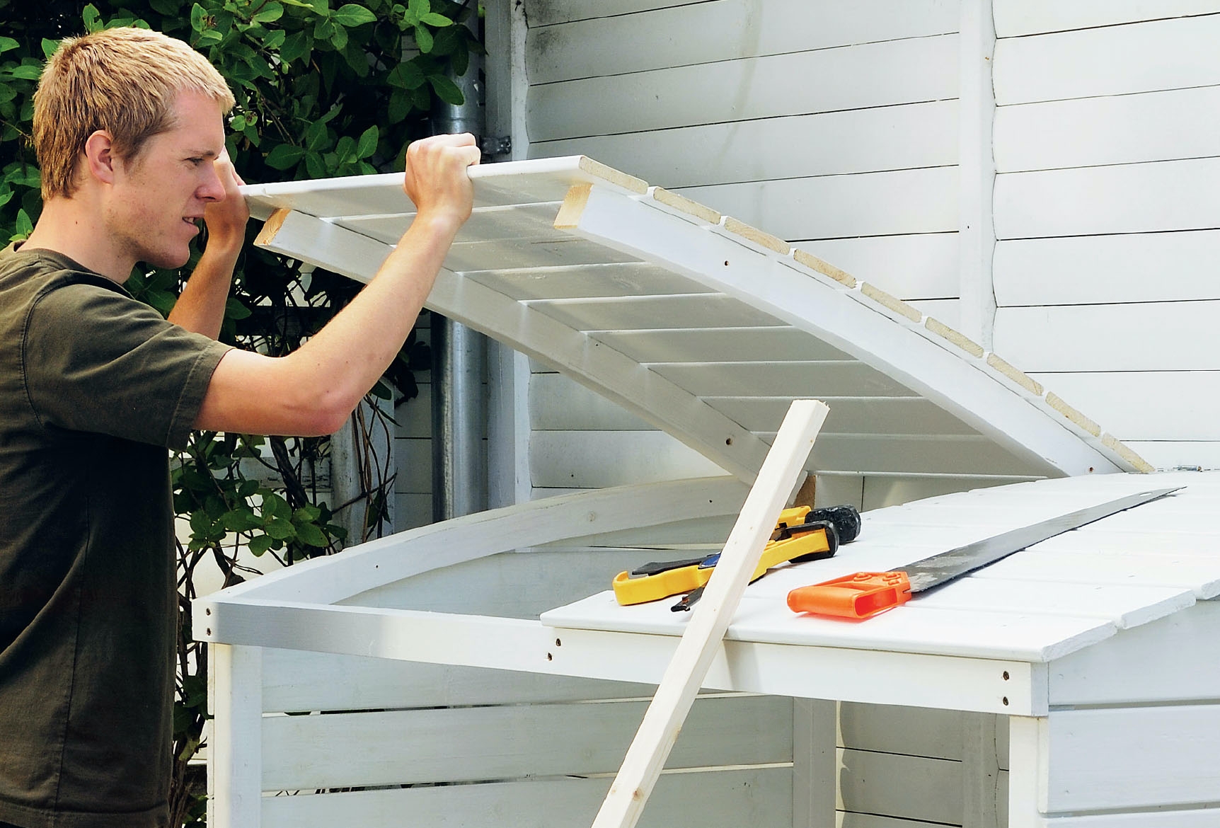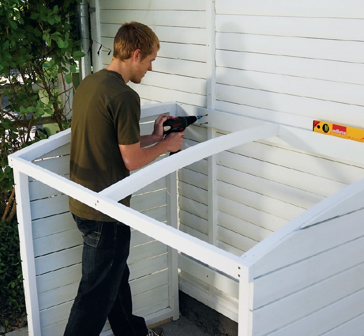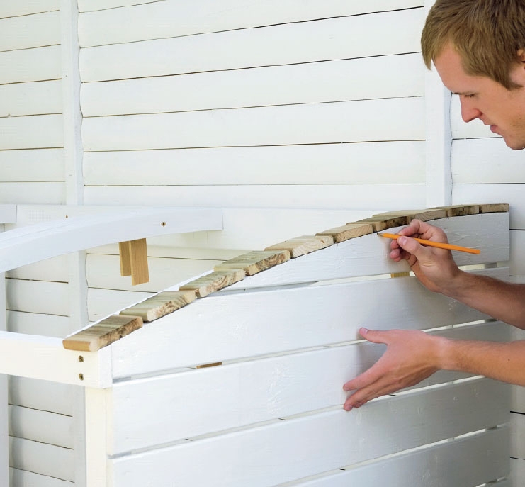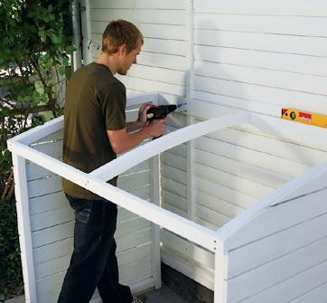 Skjulet sættes på plads. Tjek, at det står helt vandret, og skru det så fast til bagvæggen gennem tværstiverne. TIPS: Har du beskyttet benene mod fugt som foreslået i Trin 1 ovenfor, kan du justere højden med en slutskive mere eller mindre.
