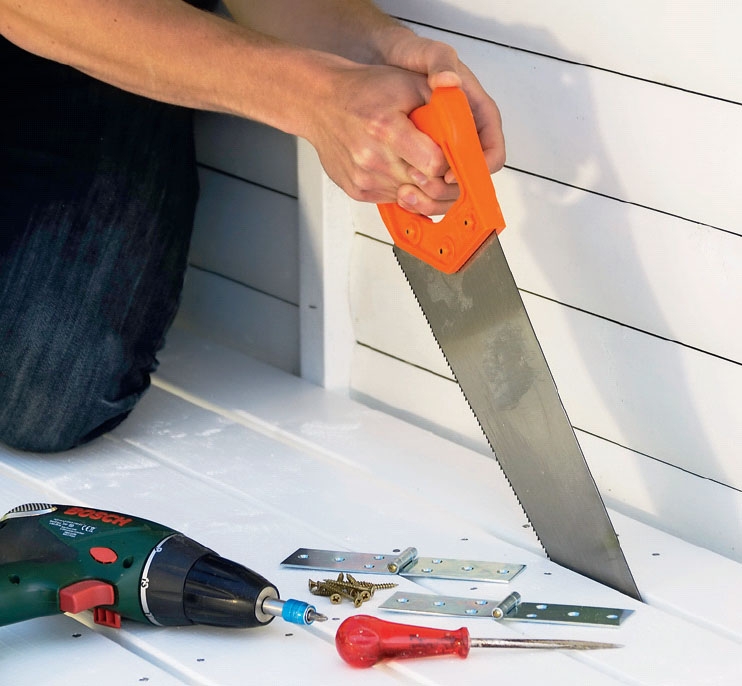 Så snart det er gjort, kan du slå låget op - et enkelt låg. Det deler du nu i to ved at save gennem beklædningslisterne midt imellem de midterste lågrevler.