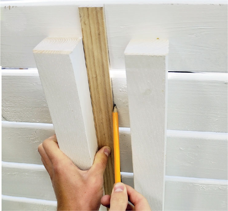 Afstanden mellem lågenes beklædningslister (E) tilpasses, så den forreste liste rækker cirka 1 cm ud over skjulets forside. Læg fx nogle stumper af beklædningslisterne ud, og marker på siderne, hvor listerne ligger bedst.