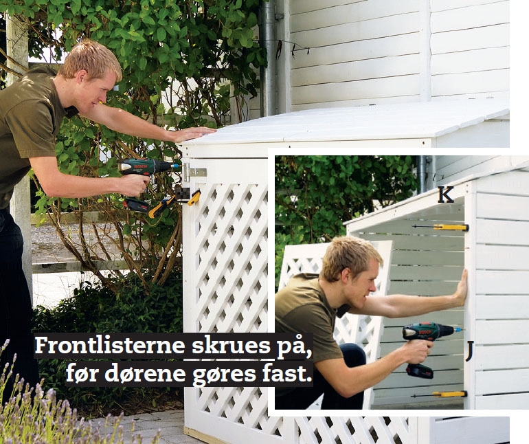 De to lodrette frontlister (J) skrues på sidernes forkant, så de danner en plan ramme sammen med overliggeren (K). Klods en liste vandret op til at stille de to døre på, fikser dørene med tvinger, og gør dem fast på skjulet gennem T-hængslerne.