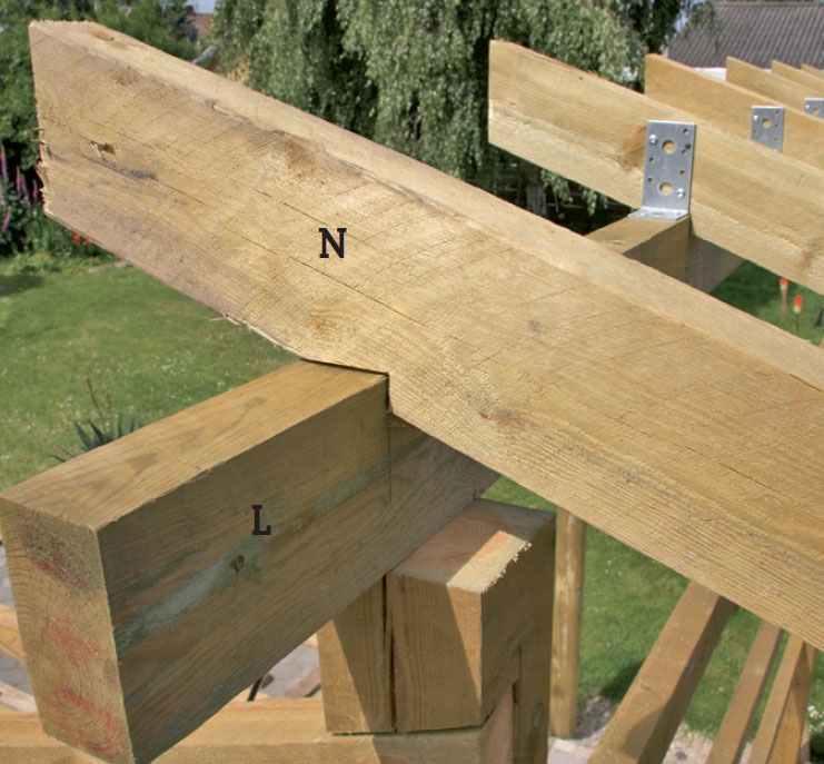 De 6 spær (N) skæres til. Spærene mærkes op sammen, på én gang. På den måde bliver de helt ens. Skær to hak (sadler) i spærene, så de får et godt anlæg mod remmene (L).