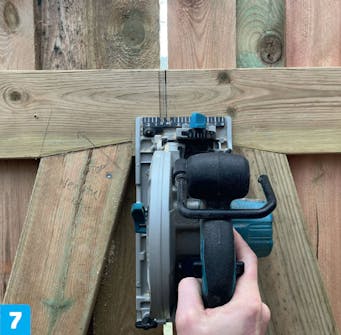 Inden du skruer tværstiveren fast, skal du have et beklædningsbræt ind mellem hængslet og stiveren. Når brættet er på plads, kan du montere tværstiveren med et par 4,5 x 70 mm skruer.