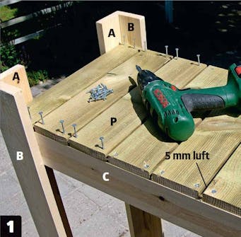 Bundbrædderne (P) fastgøres til tvær-stiverne (C) nedefra. Du skal lige vende træskelettet rundt for at kunne komme til. Brædderne monteres med en afstand på 5 mm med 4 x 50-mm-skruer.