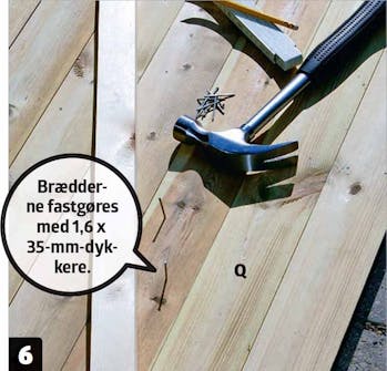 Beklædningsbrædderne (Q) sømmes fast til træskelettets tværstivere med 1,6 x 35-mm-dykkere. Beklæd alle fire sider - også døren. Hvert bræt får to dykkere, der sættes lidt skråt, så det holder ekstra godt.
