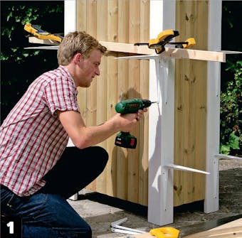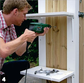Montér hyldeknægte til plantebordet uden på skuret. Hvis du spænder en liste fast til skuret og støder hyldeknægtene op til den, kan du nemt se, når højden passer. Fastgør med 4 x 40-mm-skruer.