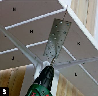 Brædderne skrues fast til hyldeknægtene, og den skrå samling under de inderste brædder styrkes med sømbeslag. De fastgøres med 4 x 20-mm-skruer.