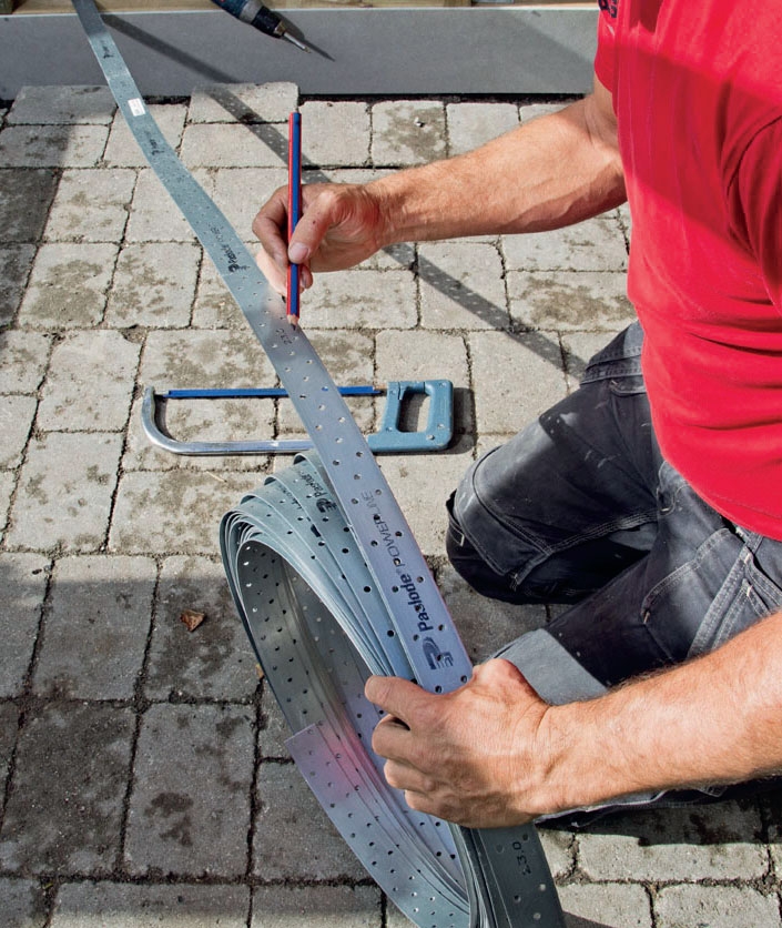 Tagremmen lægges i udskæringer i toppen af stolperne. For at finde remmens nøjagtige placering skal du sætte den midlertidigt op og strege af på alle stolperne, hvor hakkene skal være. Læg remmen løst op på skruetvinger, som du har sat på de yderste stolper, og ret til efter et vaterpas, før du sætter streger.
